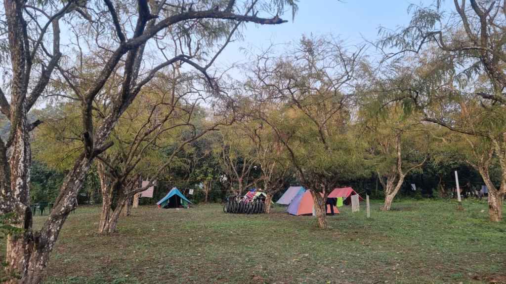 We rode back through the same forest are and reached main road. An hour ride on the highway before we reached a small hotel for lunch break. Experienced puncture on the way. Tiwariji was prompt at service to replace the tyre. Post lunch, took a left from Bail Parao towards Pawalgarh. By evenining 4:30PM we were at our destination – Eco Harryman’s homestay. It was a tent stay in the Indian gooseberry (Amla) garden.