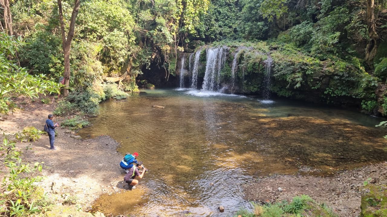 Post breakfast, took a packed lunch and learned to tie rucksack on the cycle. It was almost 10 AM when we left the base camp. Weather was still pleasant. It was a small downhill ride for 3 km until Ramnagar road junction. We turned right and after riding for a few kilometers on Ramnagar road, took exit to a smaller road. Enjoyed the nature for sometime . Again joined a main road to ride for sometime and took another exit. Another couple of kilometers through forest and farms and we were at the Barati Rau waterfall base. We parked the cycles and walked a nature’s trail through dense forest. At the end, it was a mesmerizing view of 30 feet waterfall.