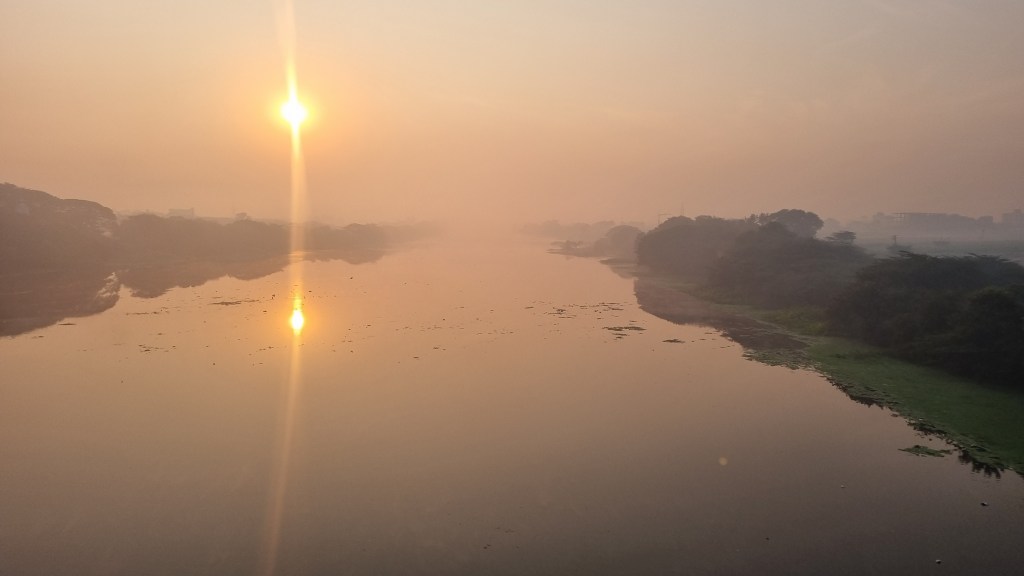 It was the last day of my expedition. I checked the map and selected the 4th Ganesh at the shortest distance, that was Theur. Began morning journey at 6:30AM. Majority of the travel was on Pune – Nagar highway. After two days of country side ride, it was more of a city ride with buildings on either side of the roads. Captured sunrise on the Bhima river. On all the three mornings, got to see the beautiful sunrise in natural environments.